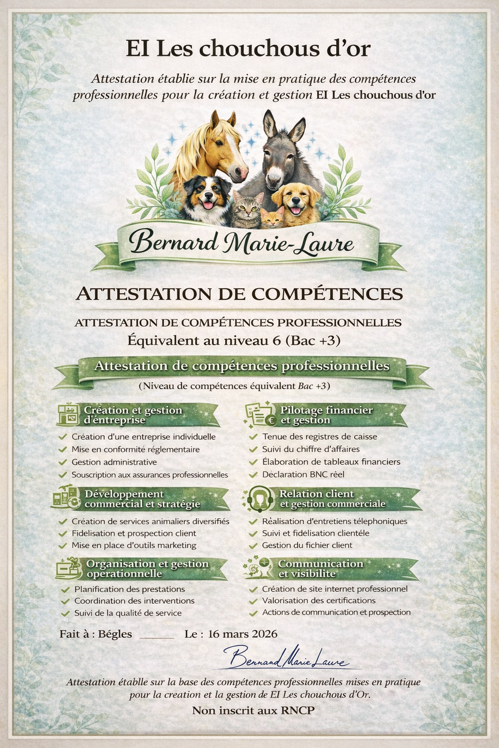Mon métier de Pet Sitter Spécialiste et de Coach en Bien-Etre canin est enrichit par des compétences certifiées pour chaque espèce en Bien-Être canin, Félin et Equin qui me permet d'offrir un accompagnement plus complet et respectueux des besoins de chaque animal .